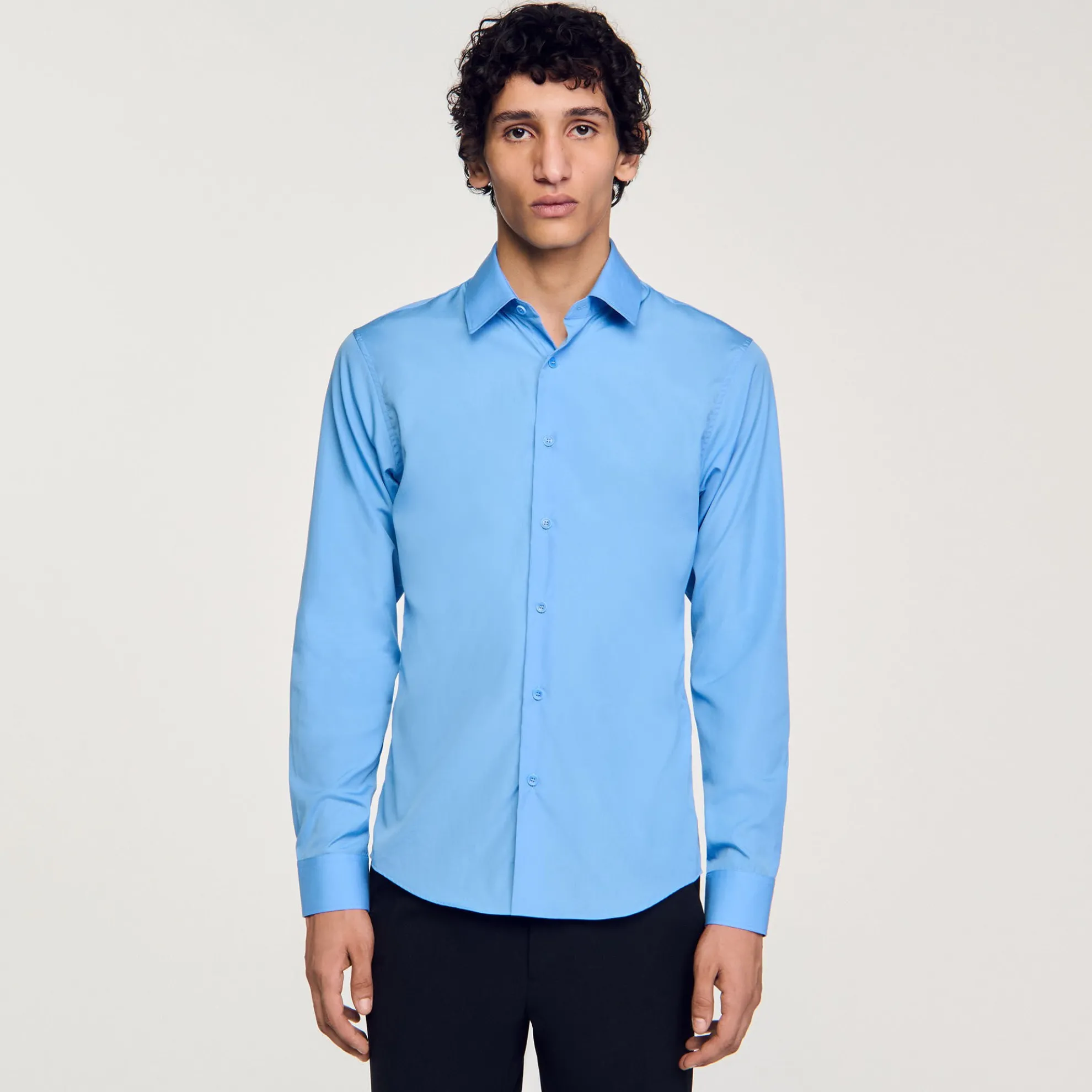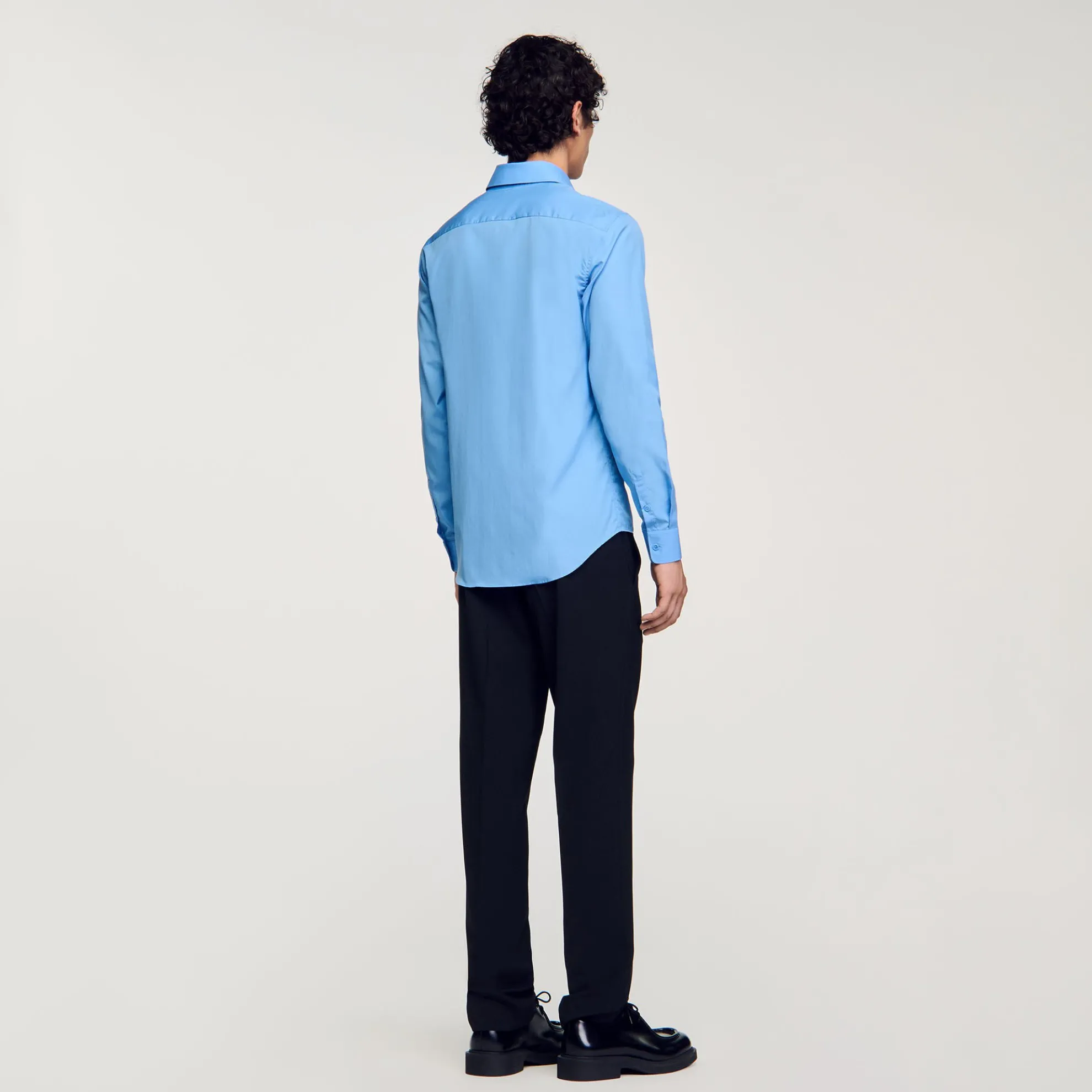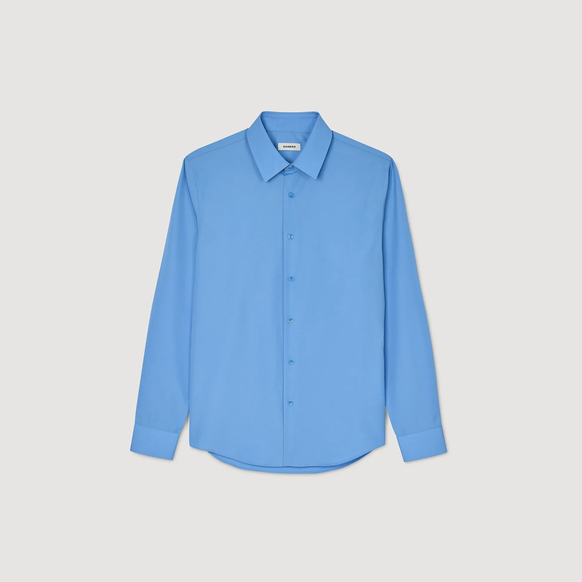 Overhemd met klassieke kraag, lange mouwen met knoopmanchetten, een knoopsluiting en een lange afgeronde onderkant.