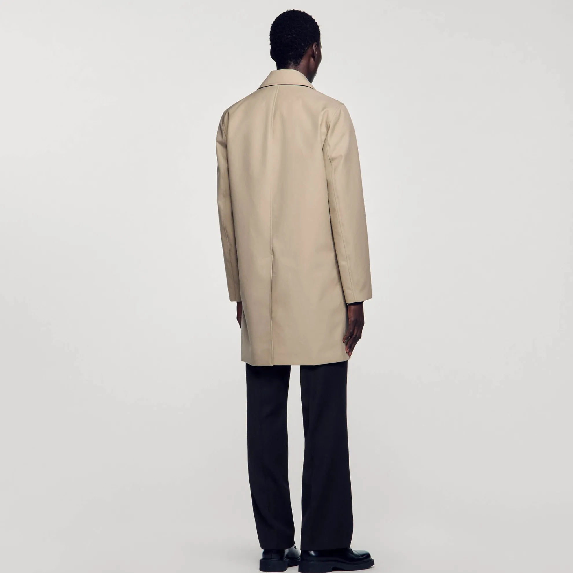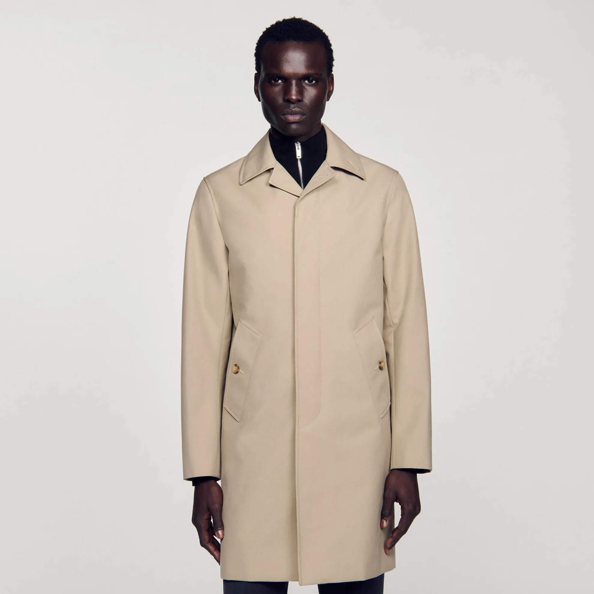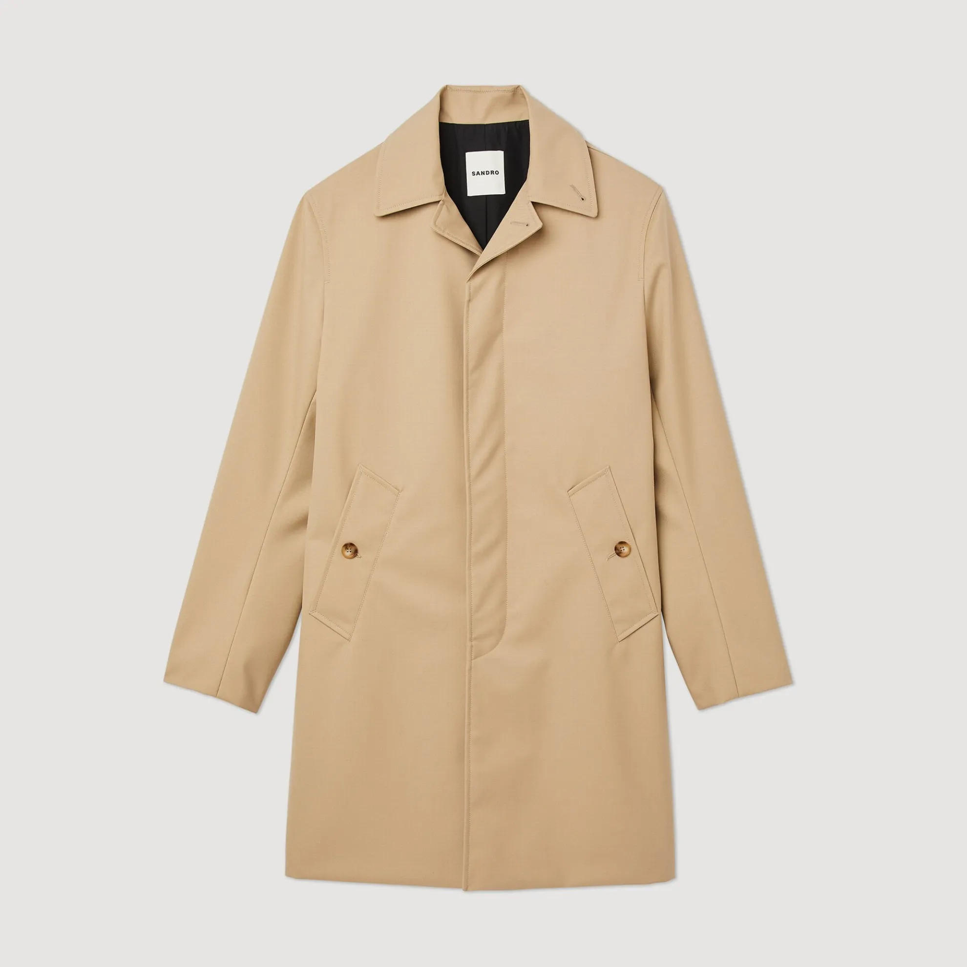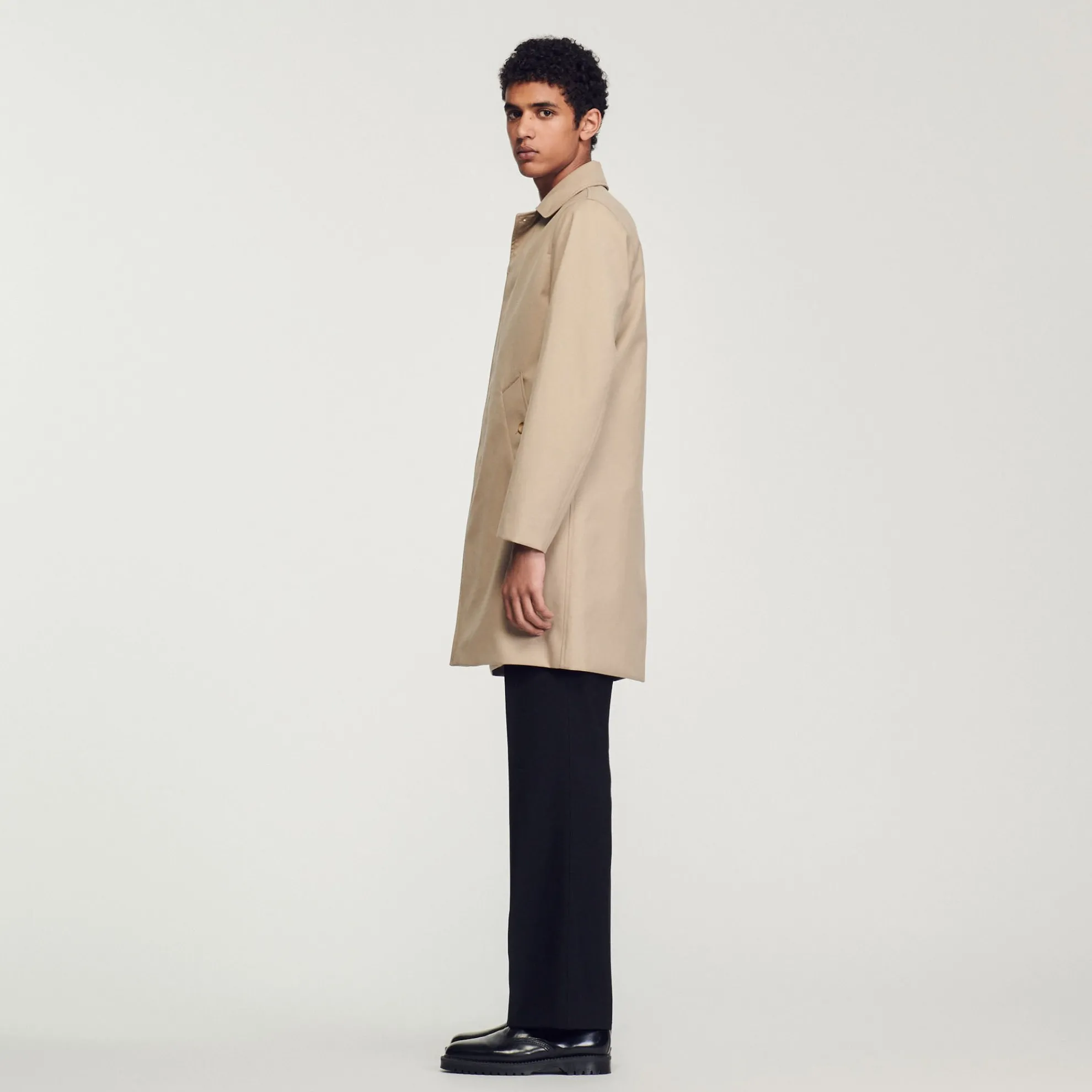 Halflange regenjas met lange mouwen, een overhemdkraag en een knoopsluiting.
