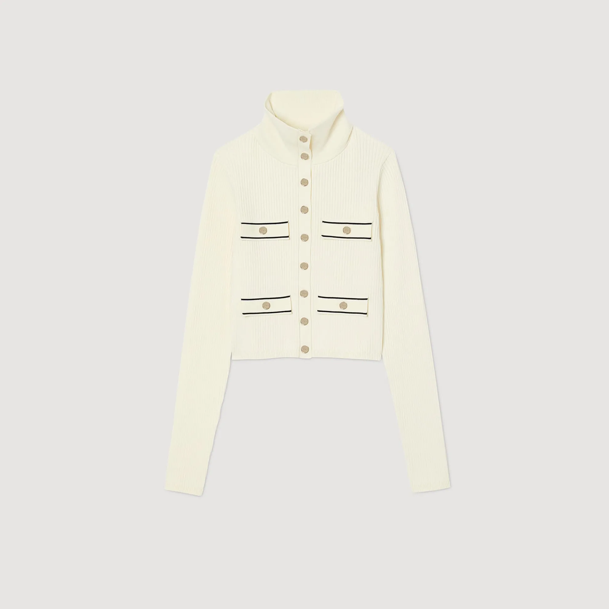 Ribgebreid cardigan vest met opstaande schipperskraag, lange mouwen, drukknoopsluiting en zakken met contrasterende biezen.