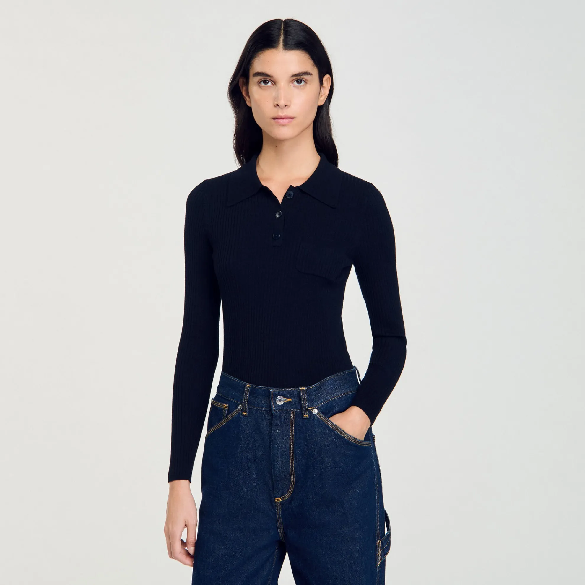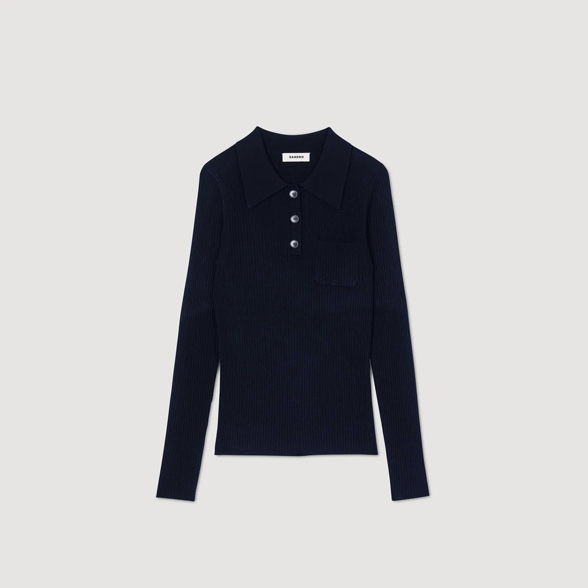 Geribde trui met gevlekt effect, button-down polokraag, lange mouwen en opgestikte zak op de borst.