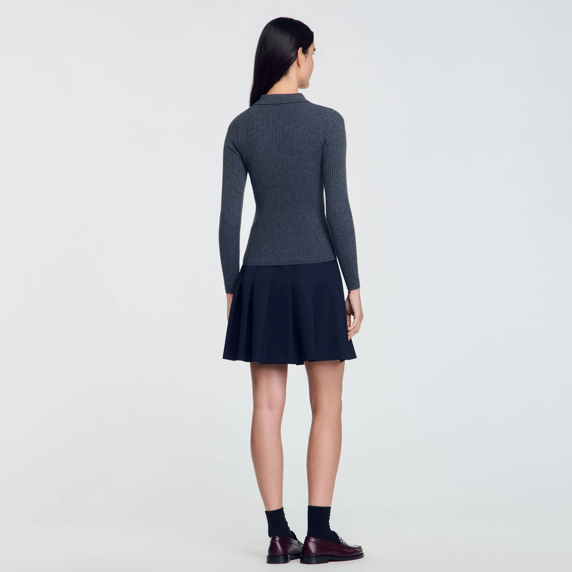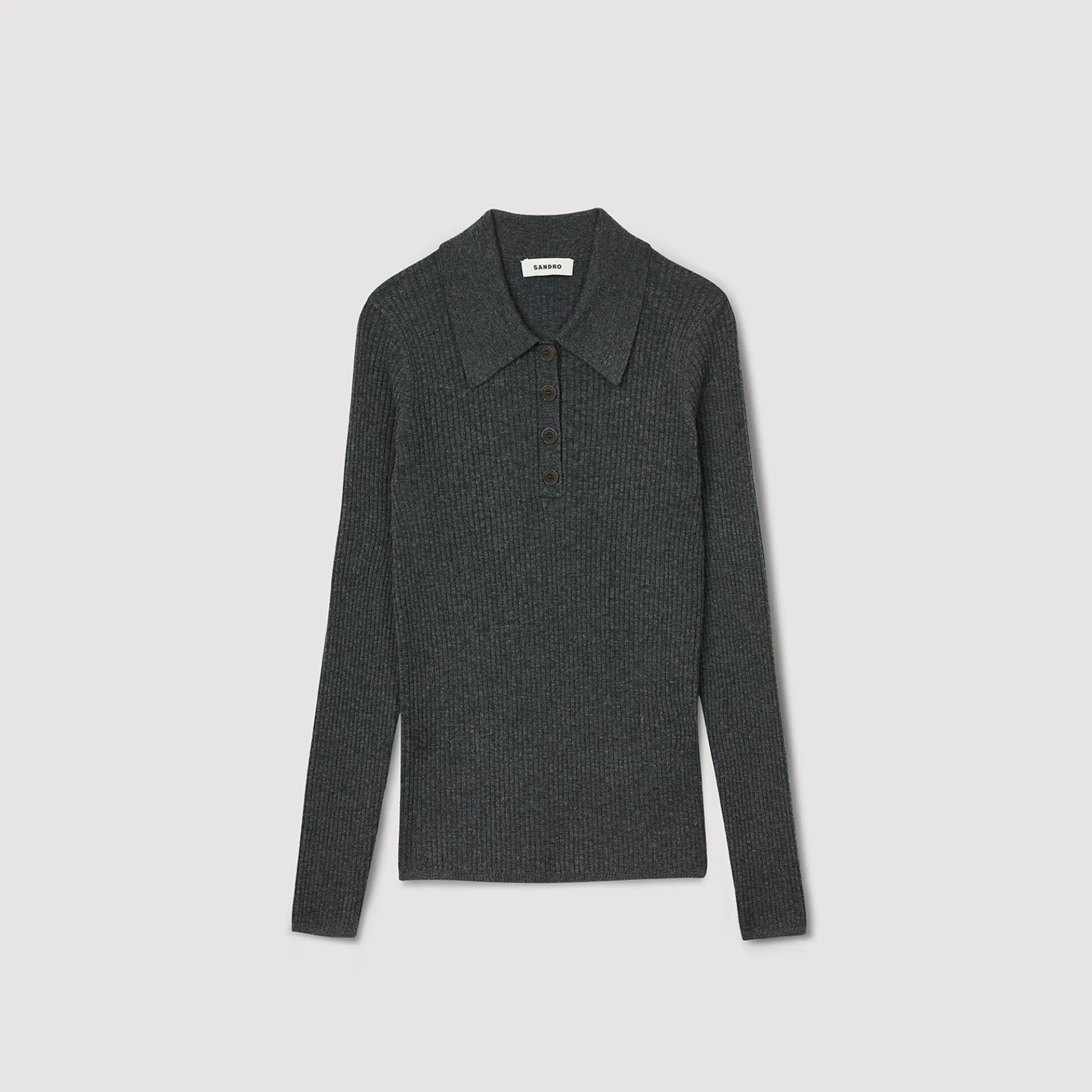 Geribde trui met gevlekt effect, button-down polokraag, lange mouwen en opgestikte zak op de borst.