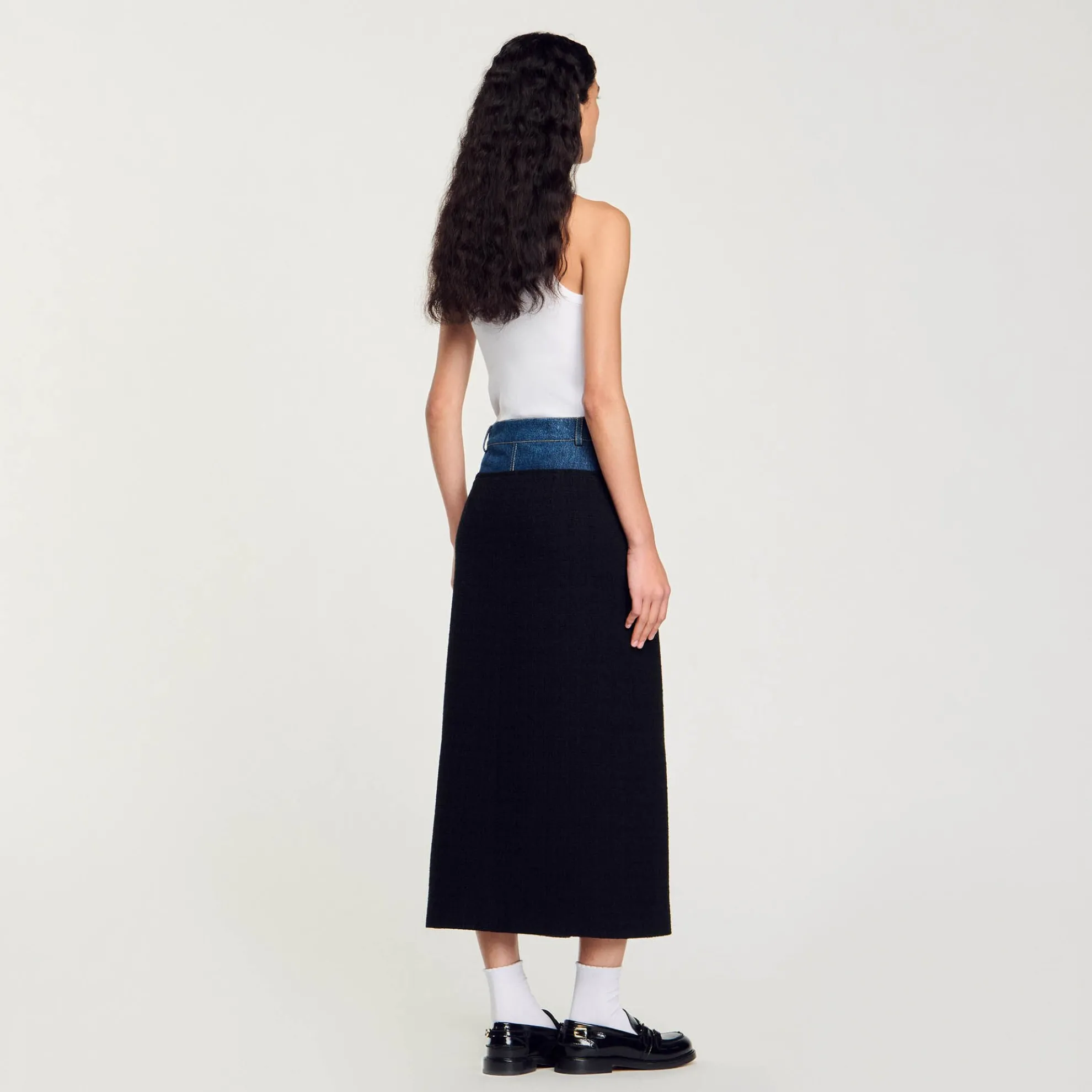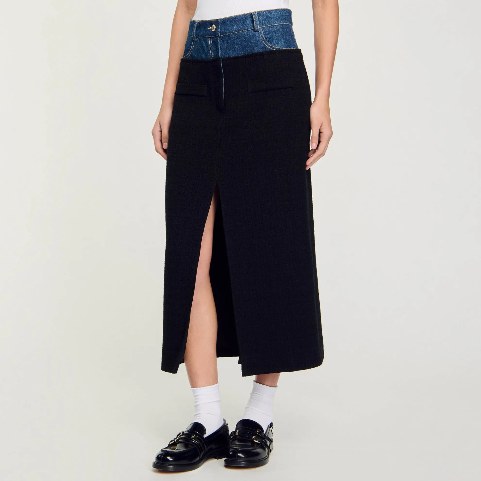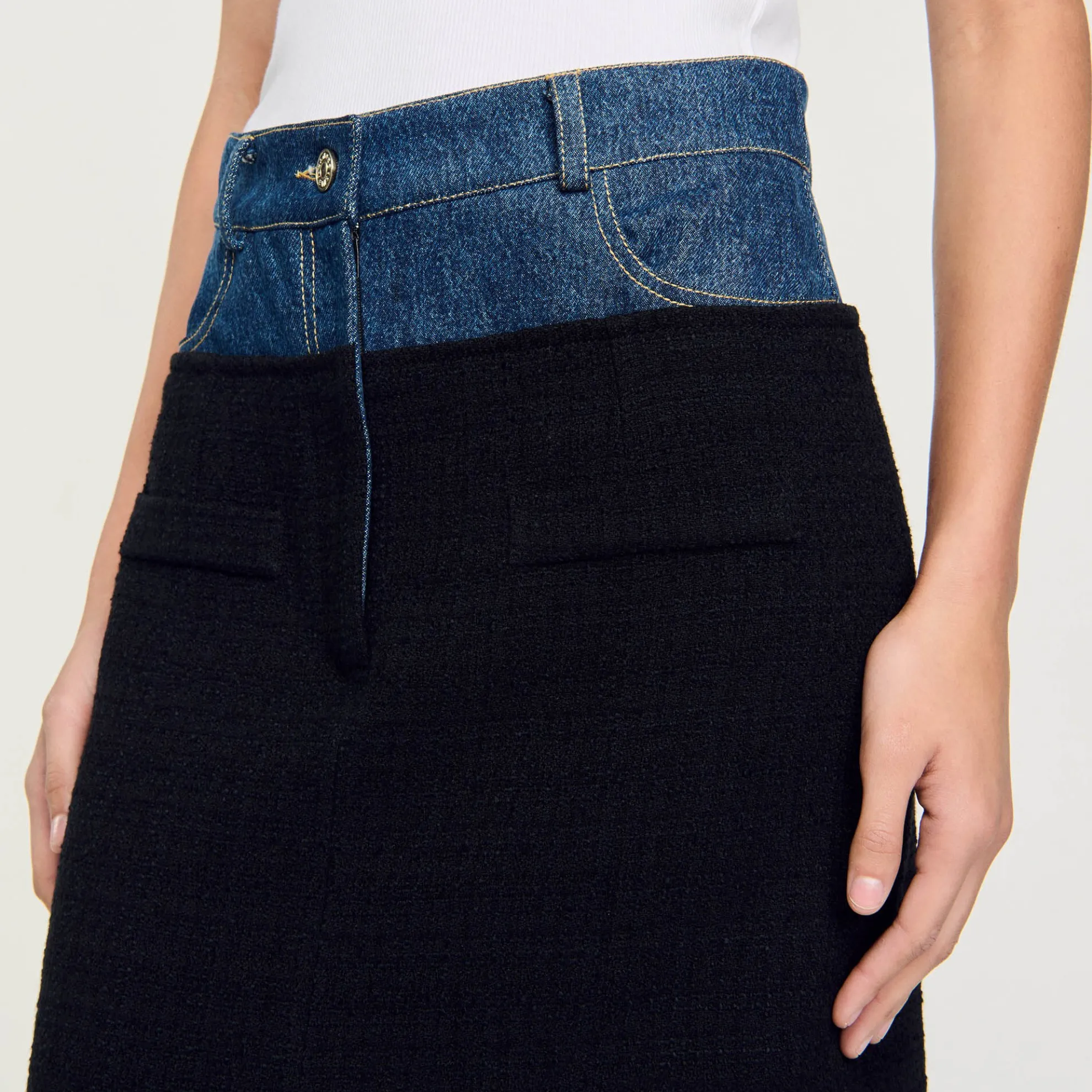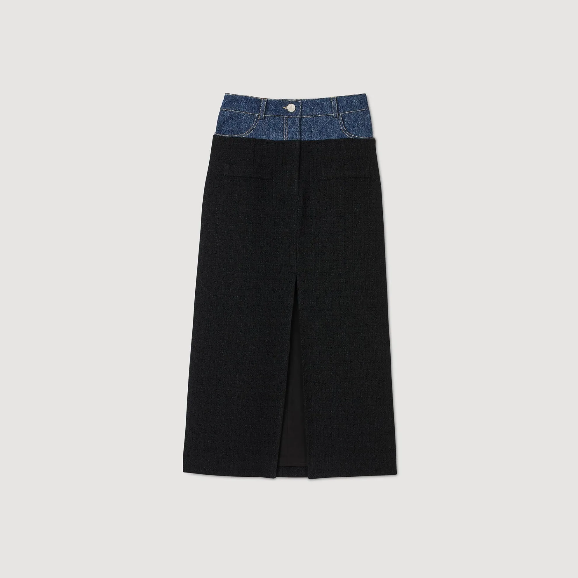 Rok in twee stoffen met denim en tweed inzetstukken, riemlussen, een split aan de voorkant en zij- en achterzakken.