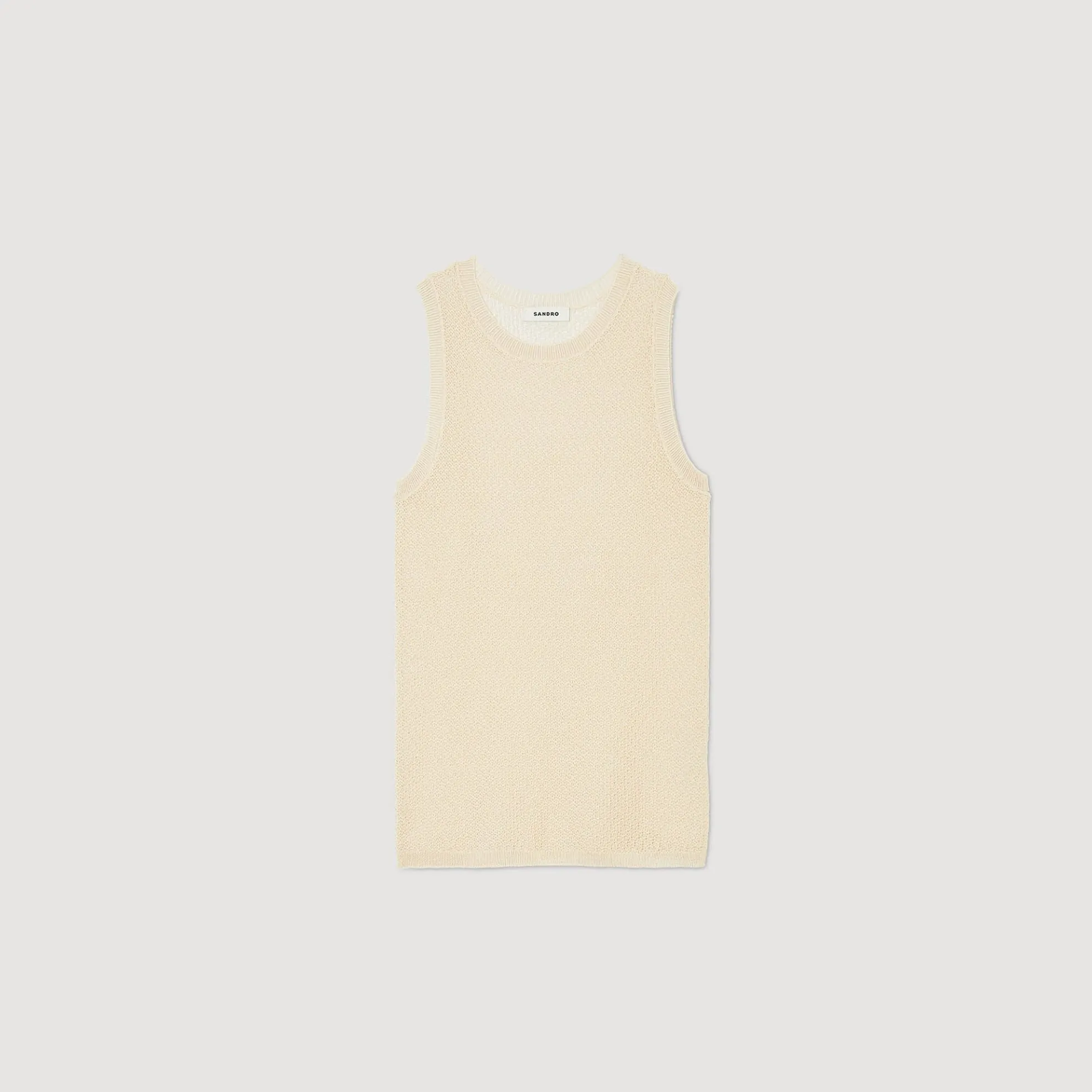 Mouwloze spencer van licht glinsterend opengewerkt breisel met ronde hals en fijn geribde boorden.
