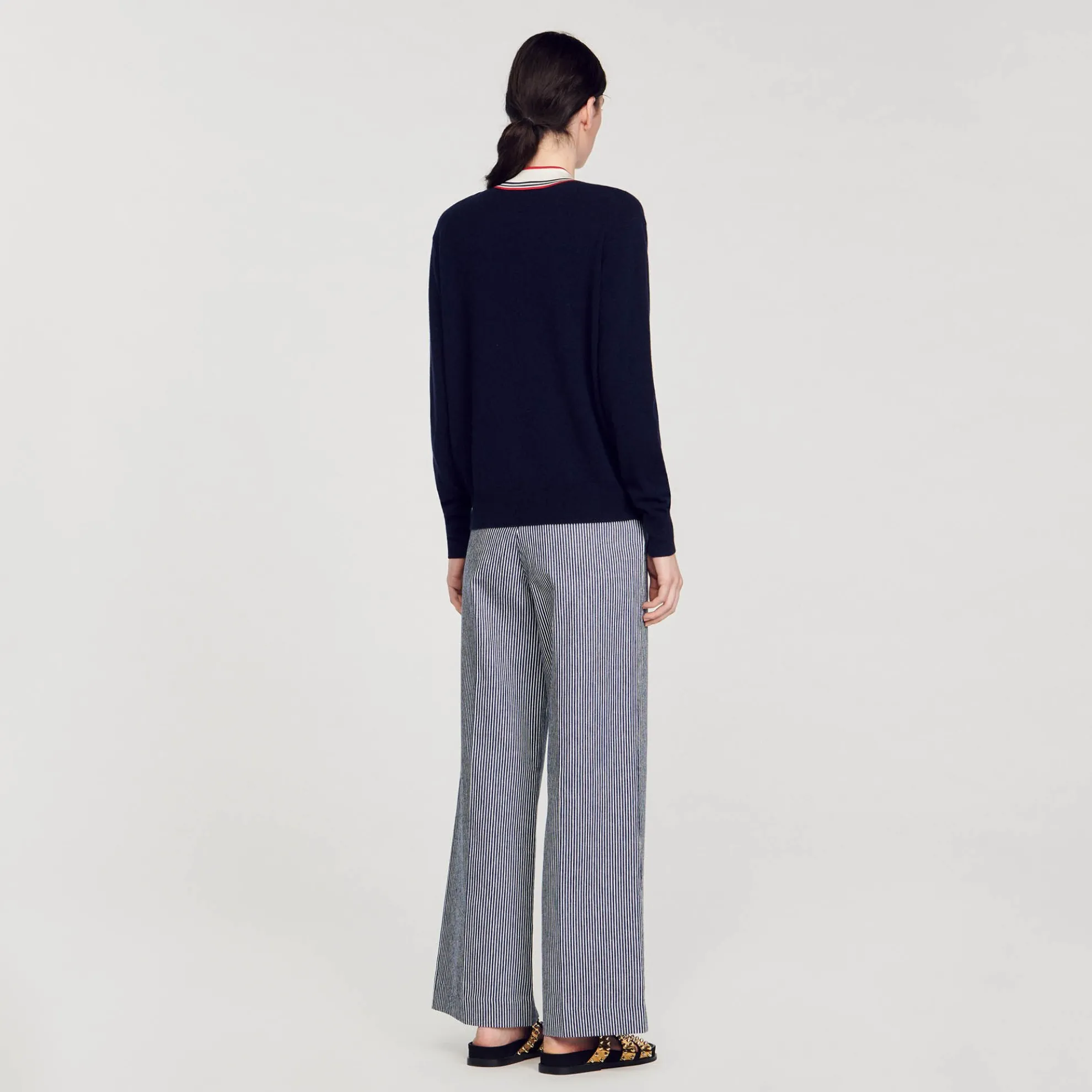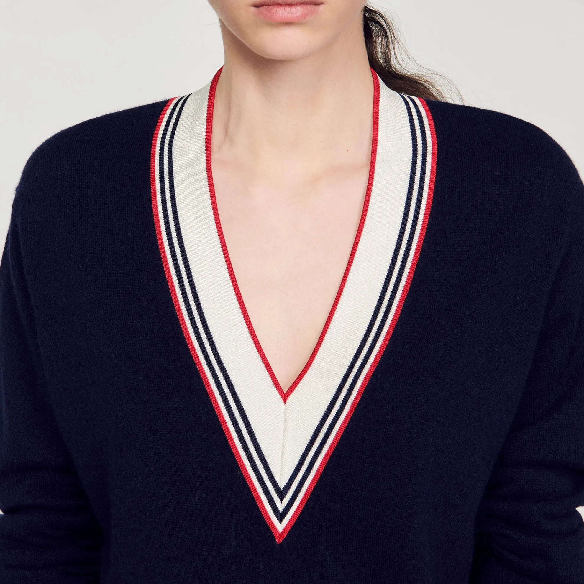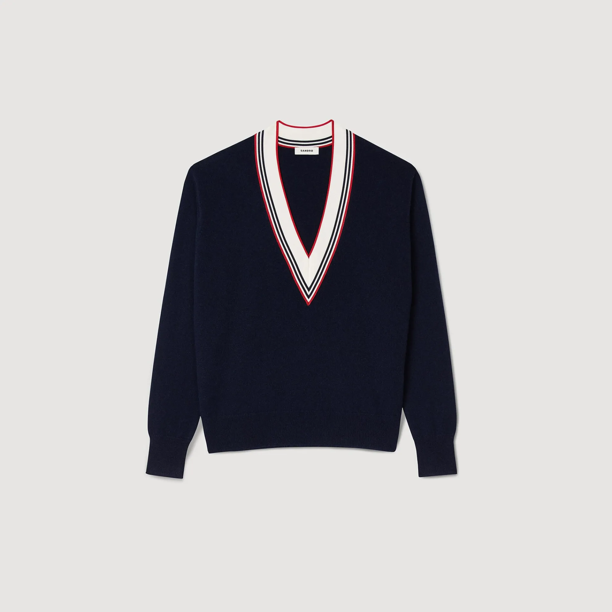 Trui van wol en kasjmier met gestreepte V-hals en lange mouwen versierd met strepen bij de halslijn.