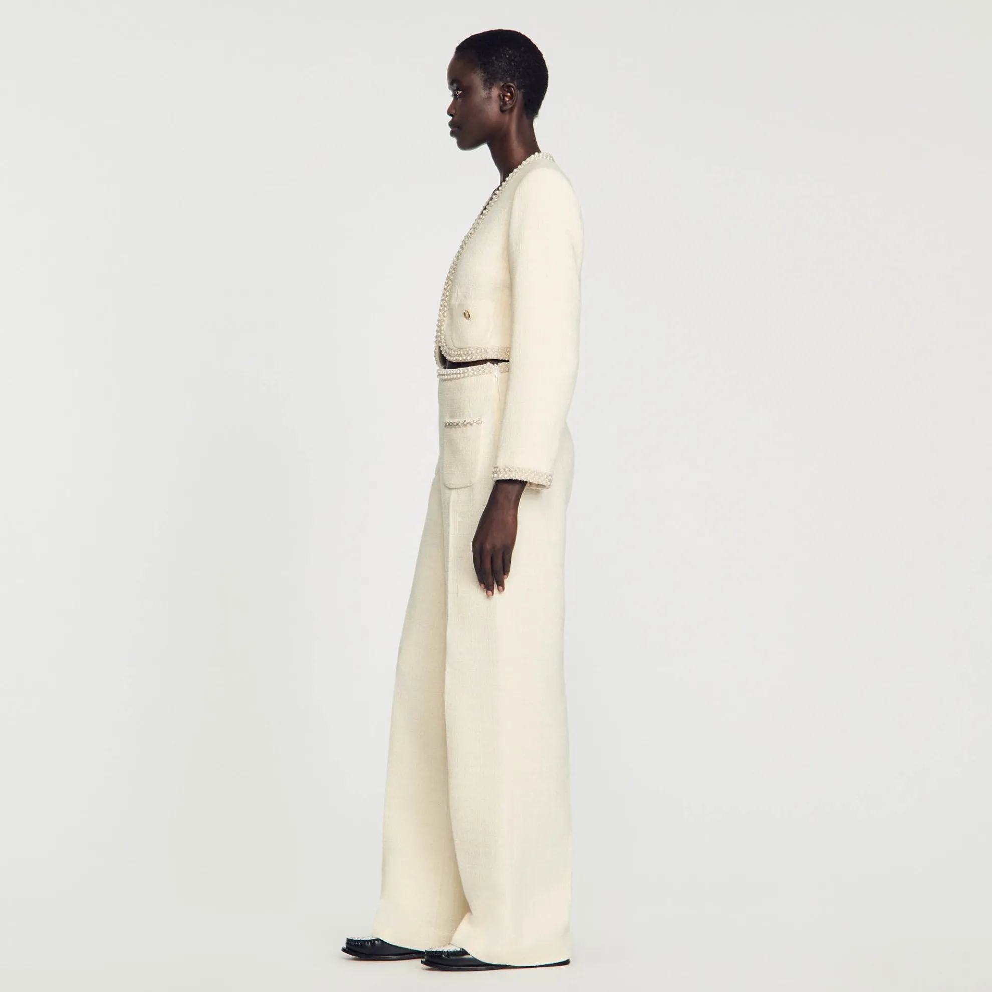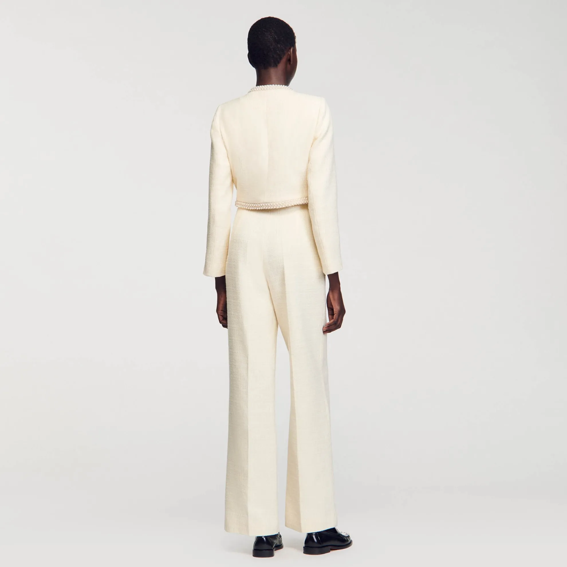 Tweed broek met hoge taille, galon met parels en opgestikte zakken in de taille.