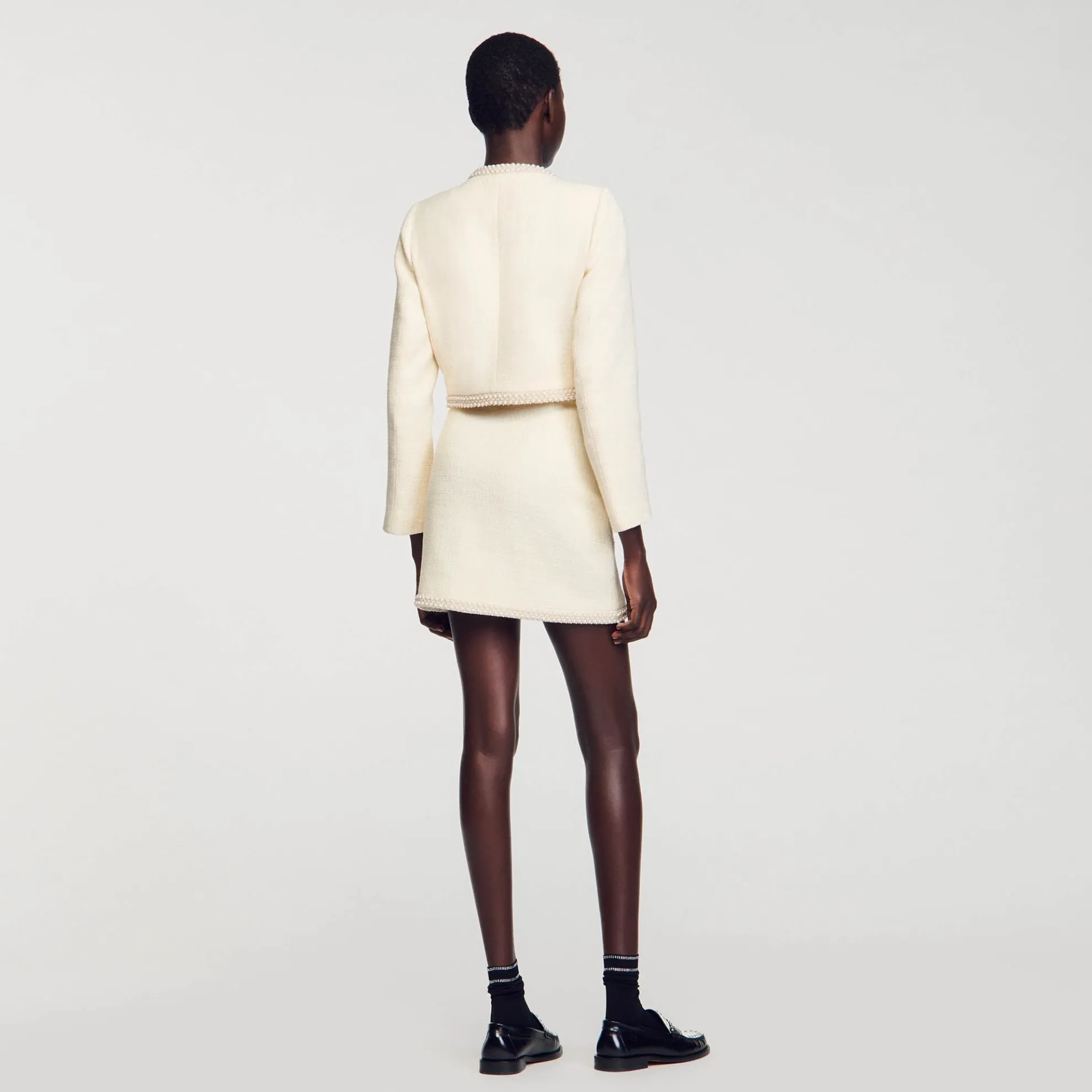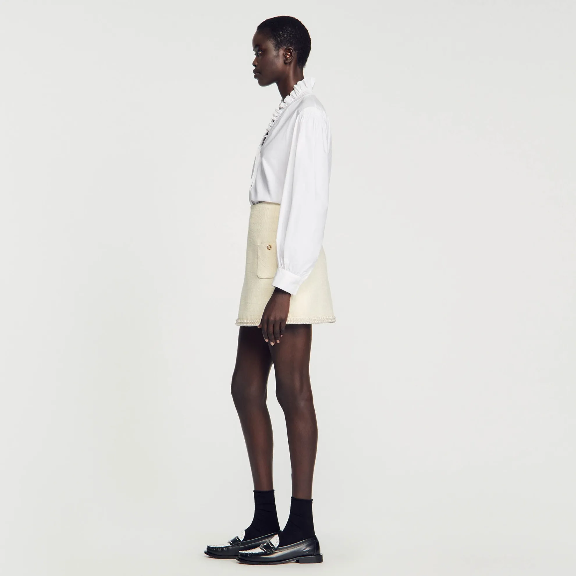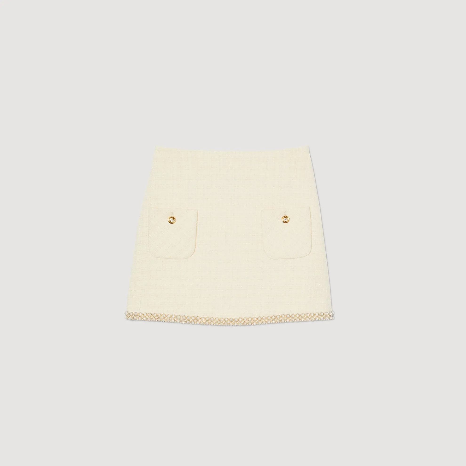 Korte tweed rok met opgestikte zakken en parelmoeren details op de zoom.